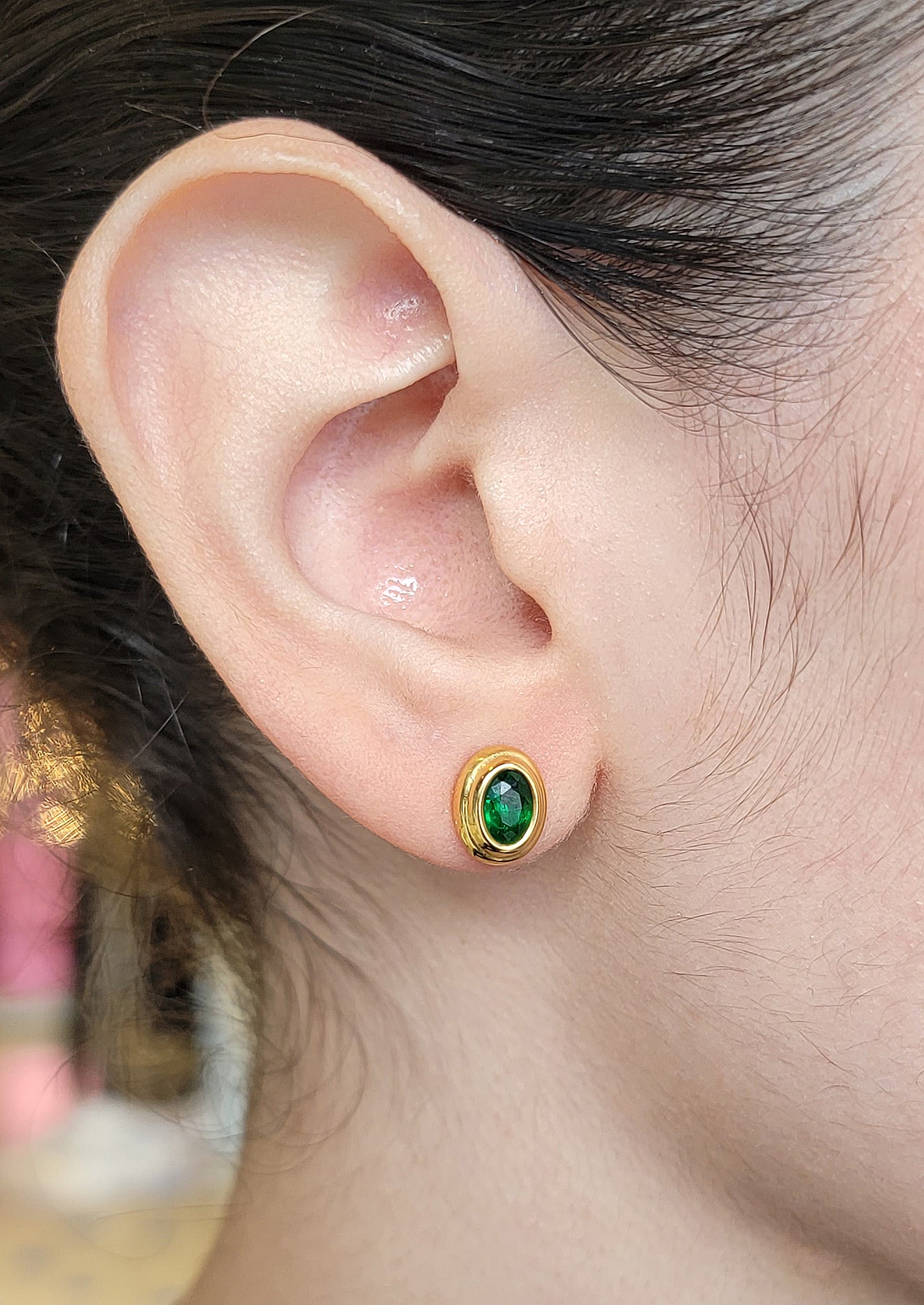 Aretes tipo studs, dorados de acero inoxidable con chapa de oro de 14k y zirconias en rojo y verde.