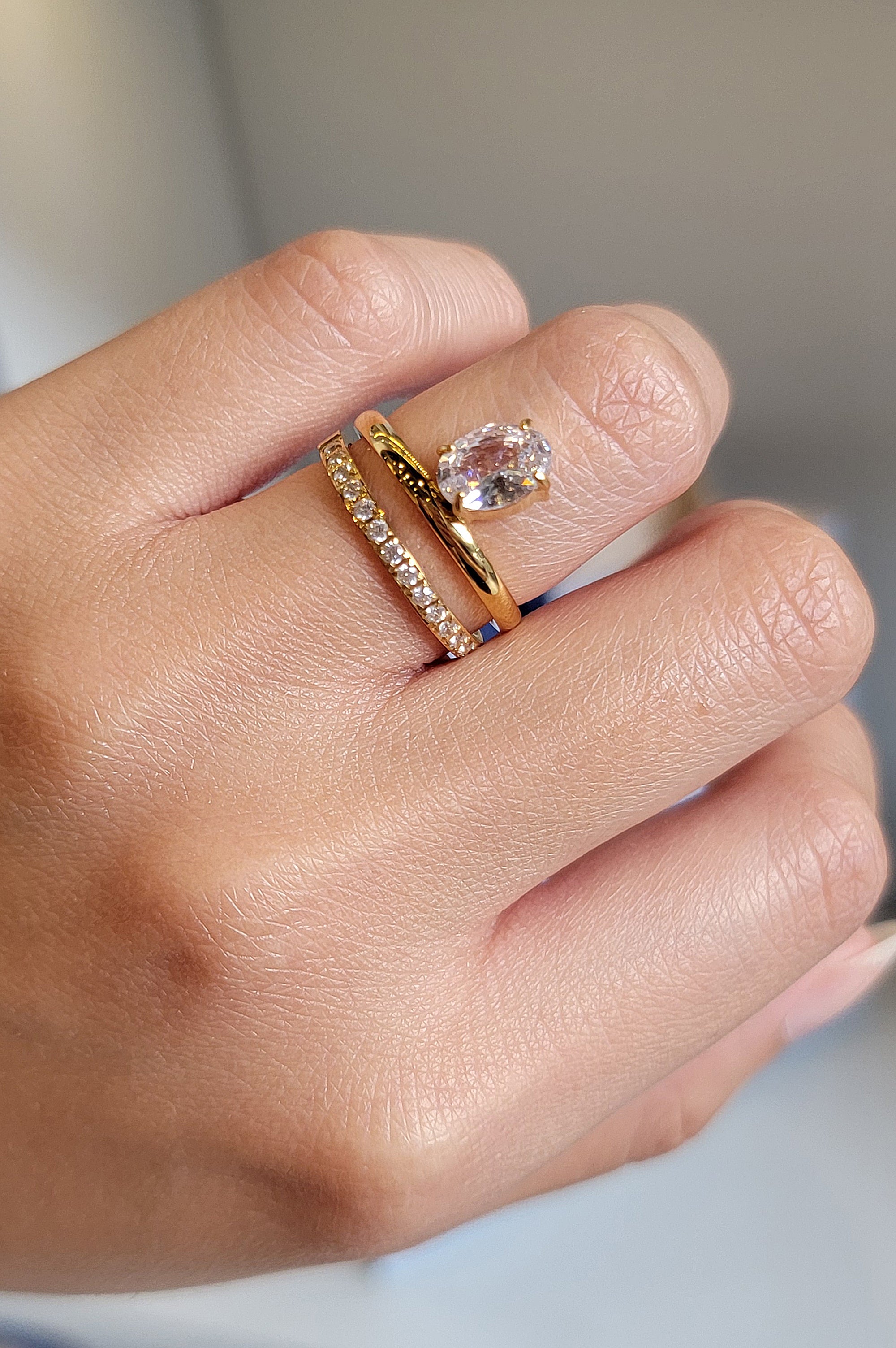 Anillo dorado doble de zirconias, en acero inoxidable con chapa de oro de 14k.