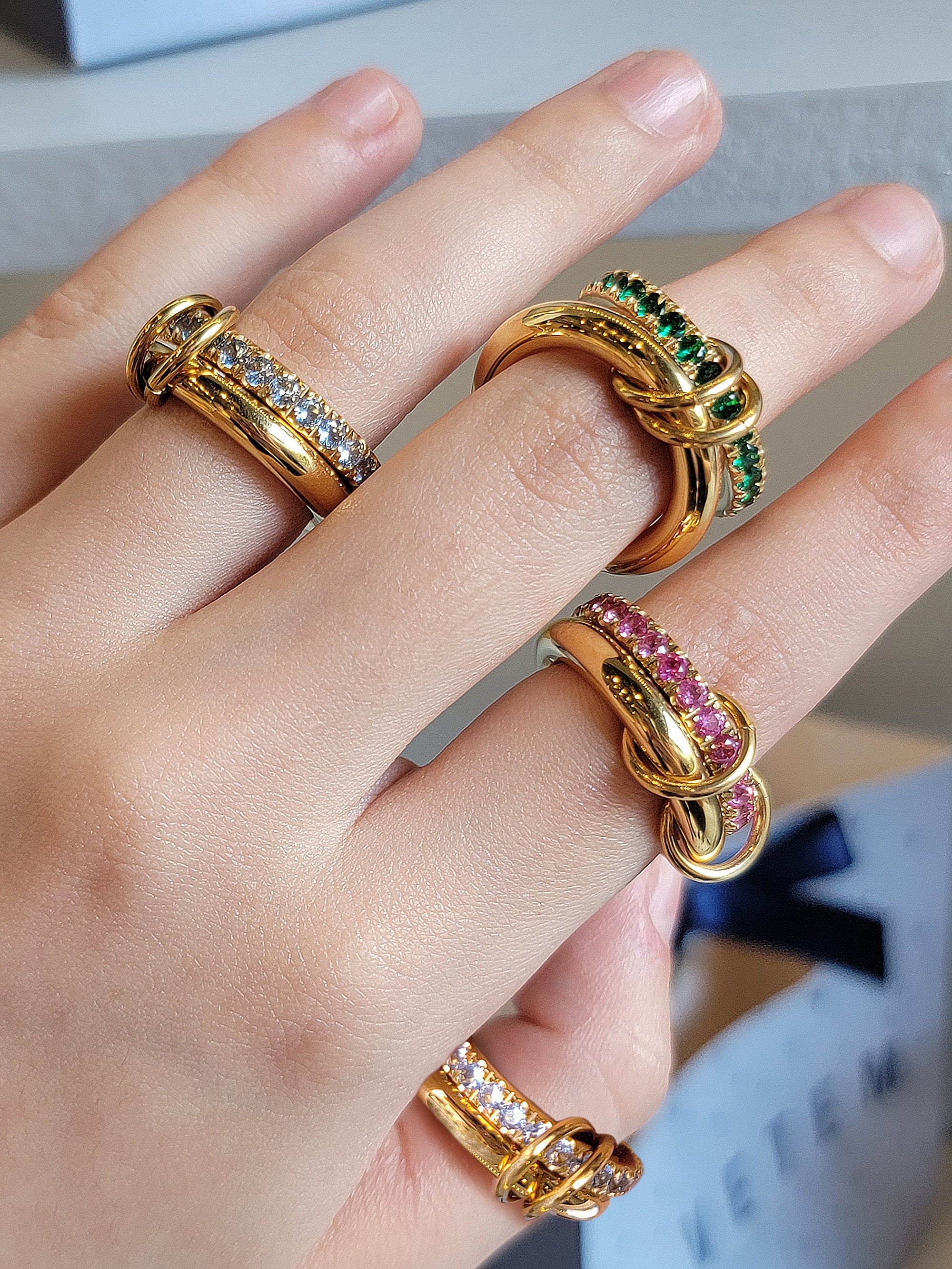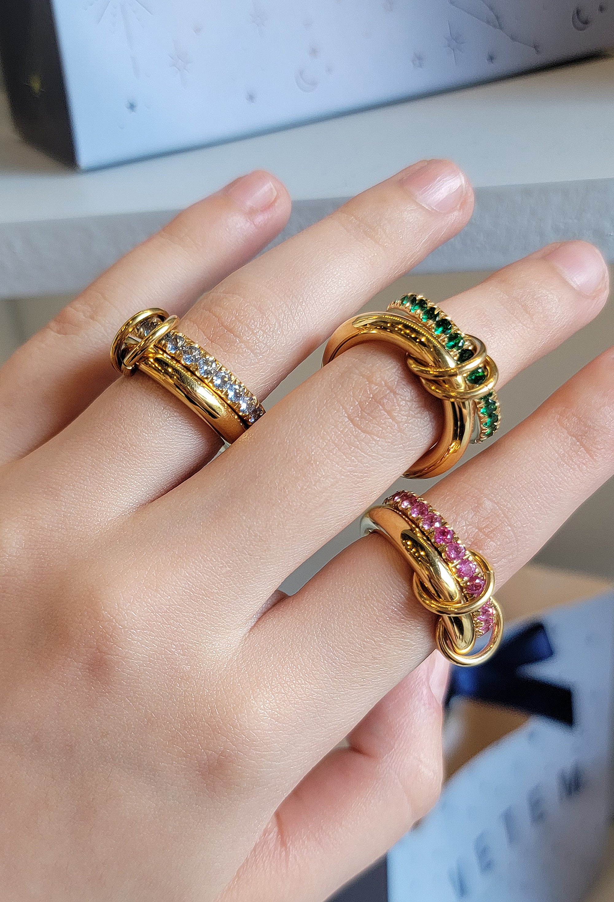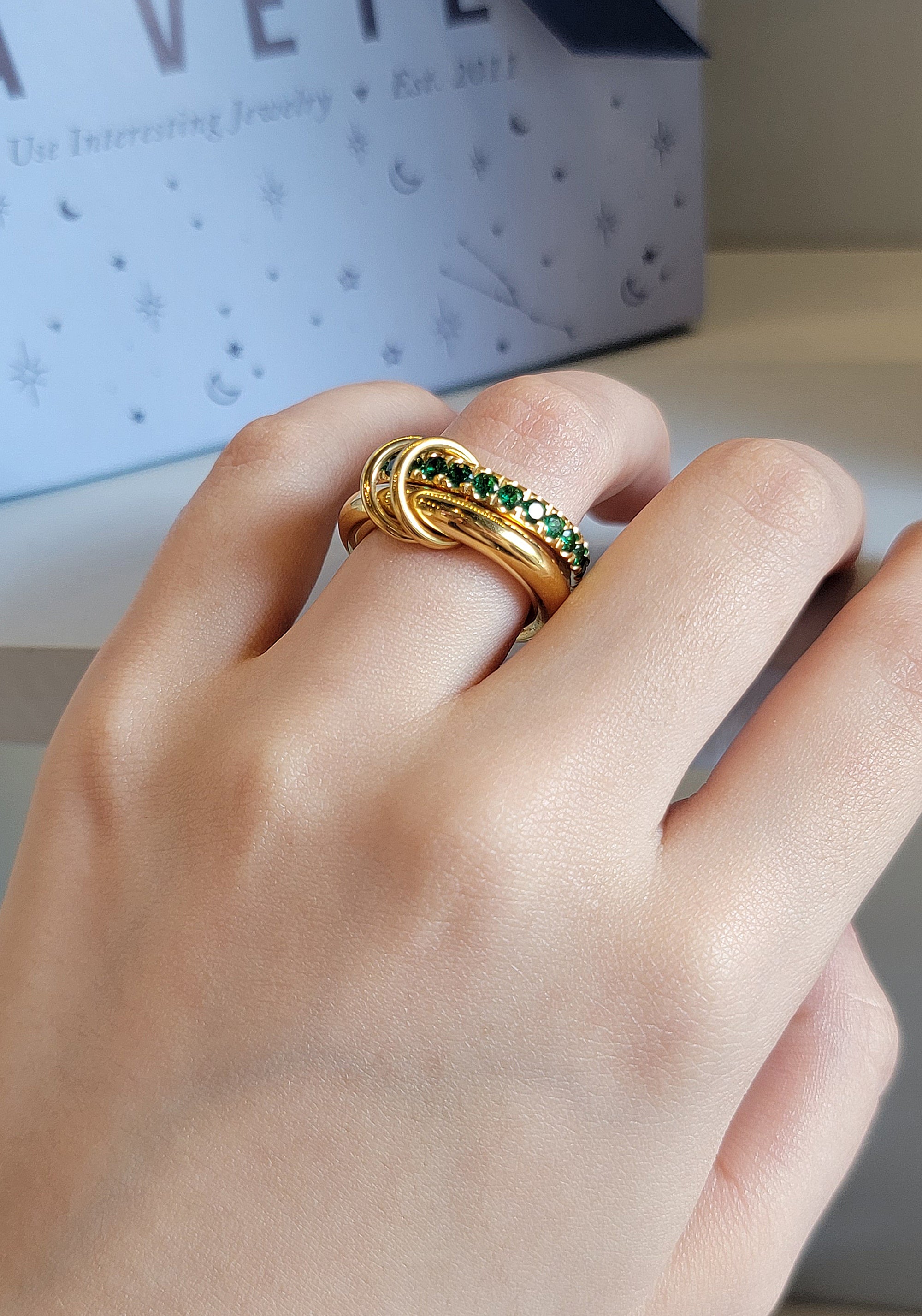 Anillo doble unido con dos pequeños aros, en acero inoxidable con chapa de oro de 14k y zirconias en celeste, verde y rosa.