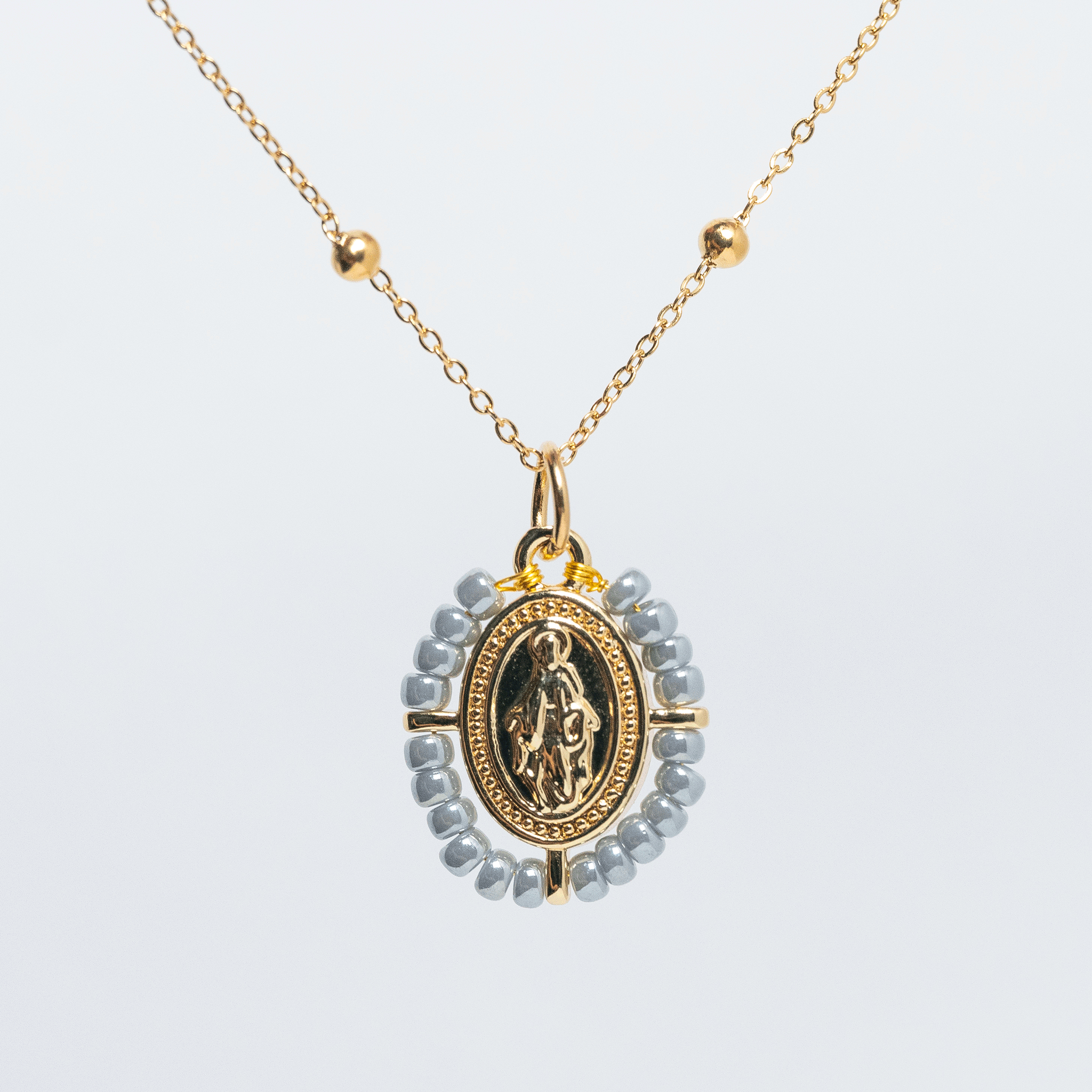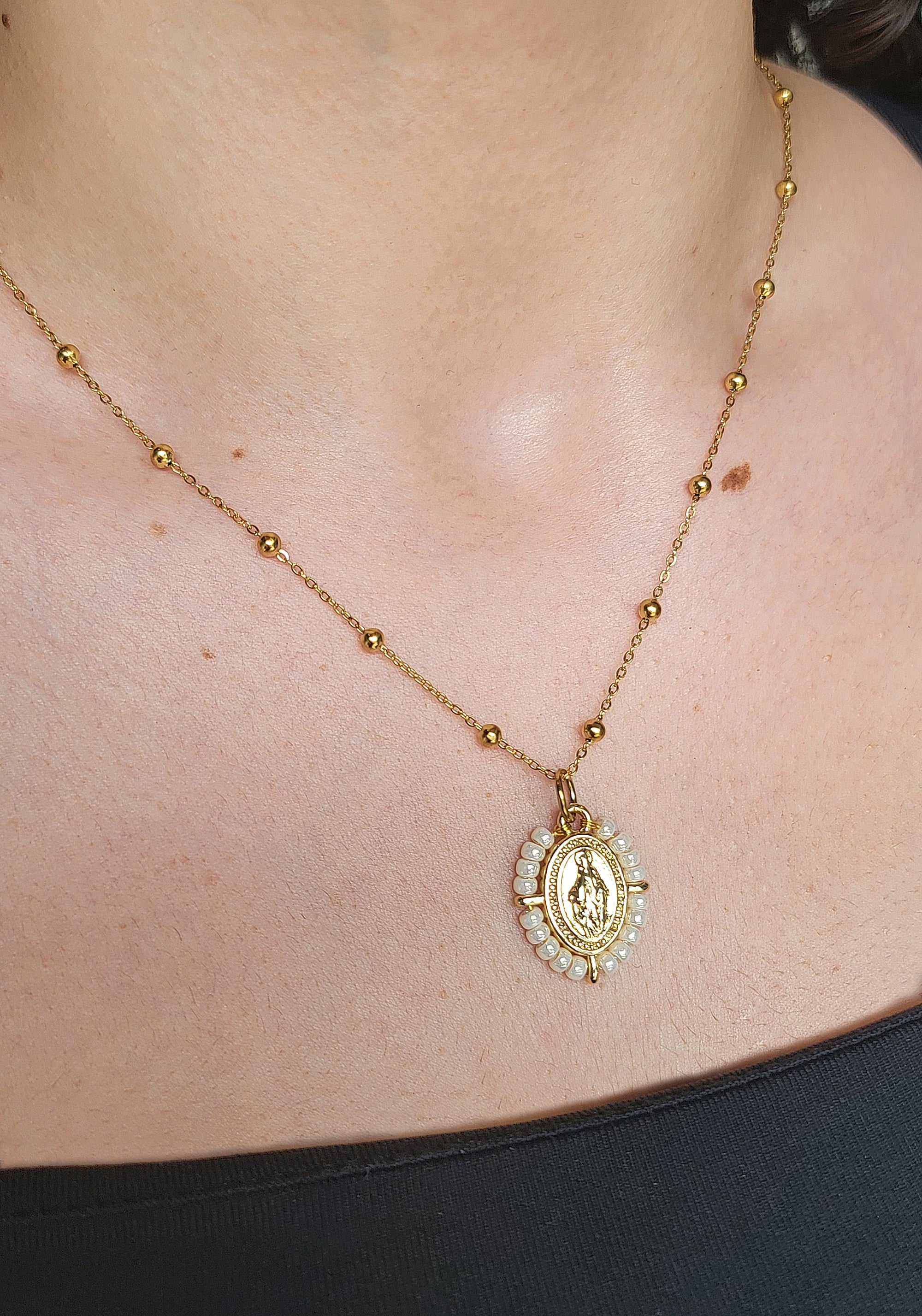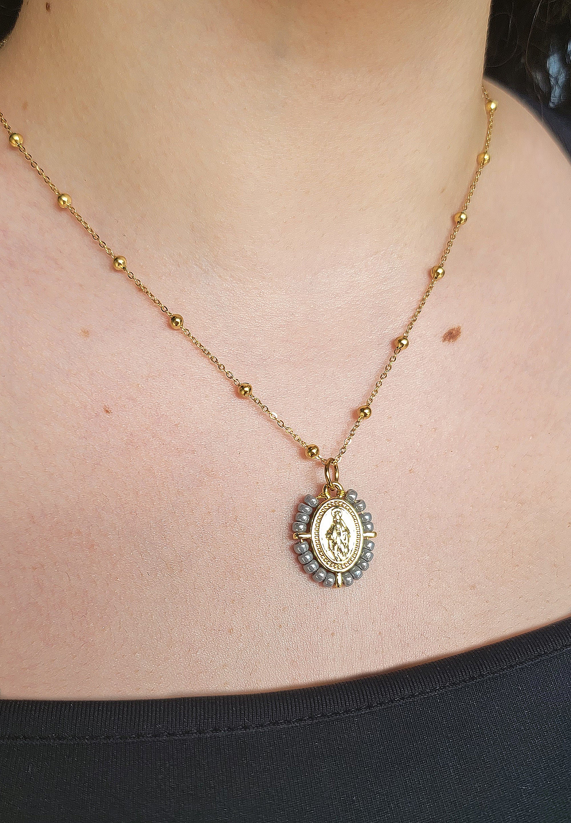 Collar con medalla de la Virgen María con cuentas de acrílico en color dorado, plateado y blanco, en acero inoxidable con chapa de oro de 14k.