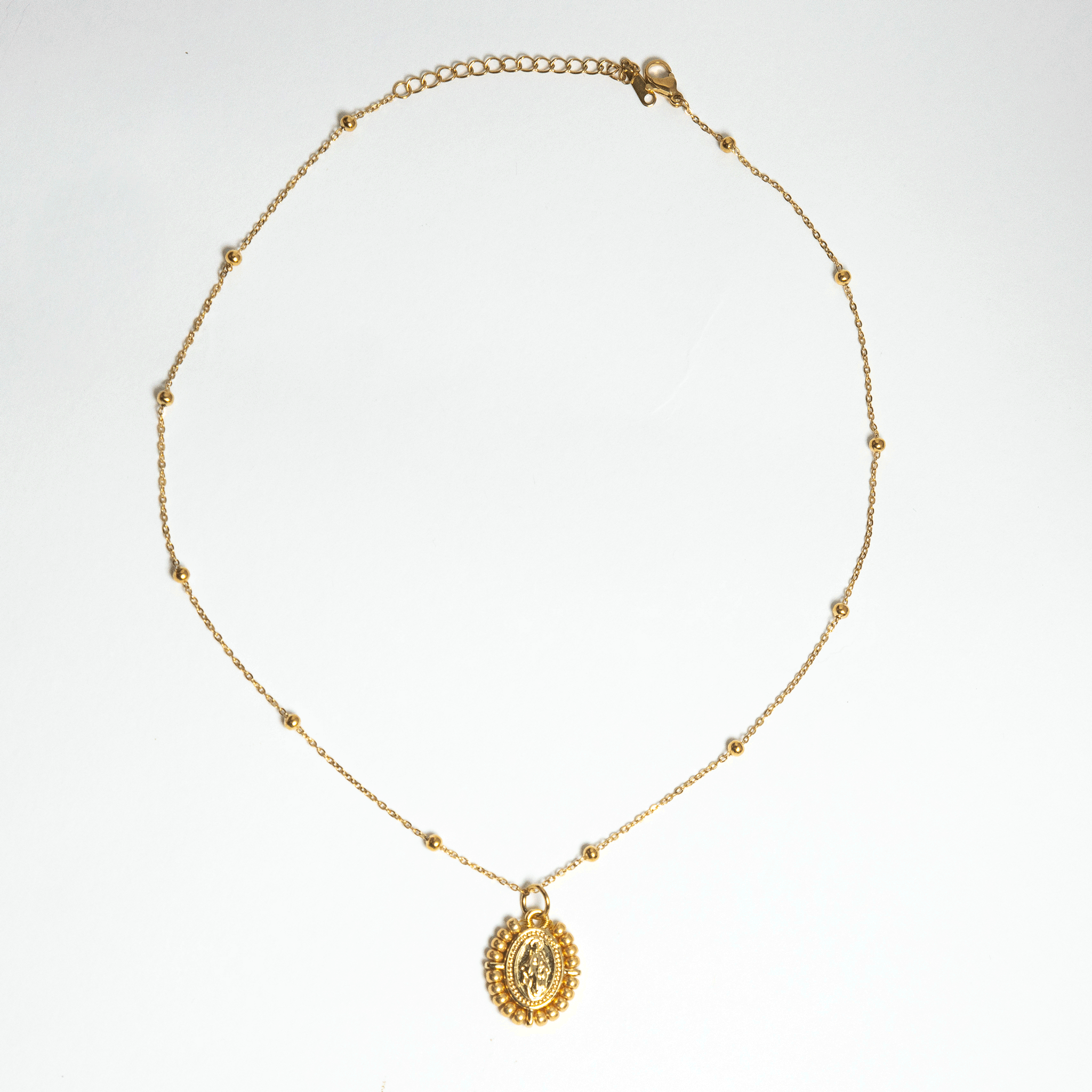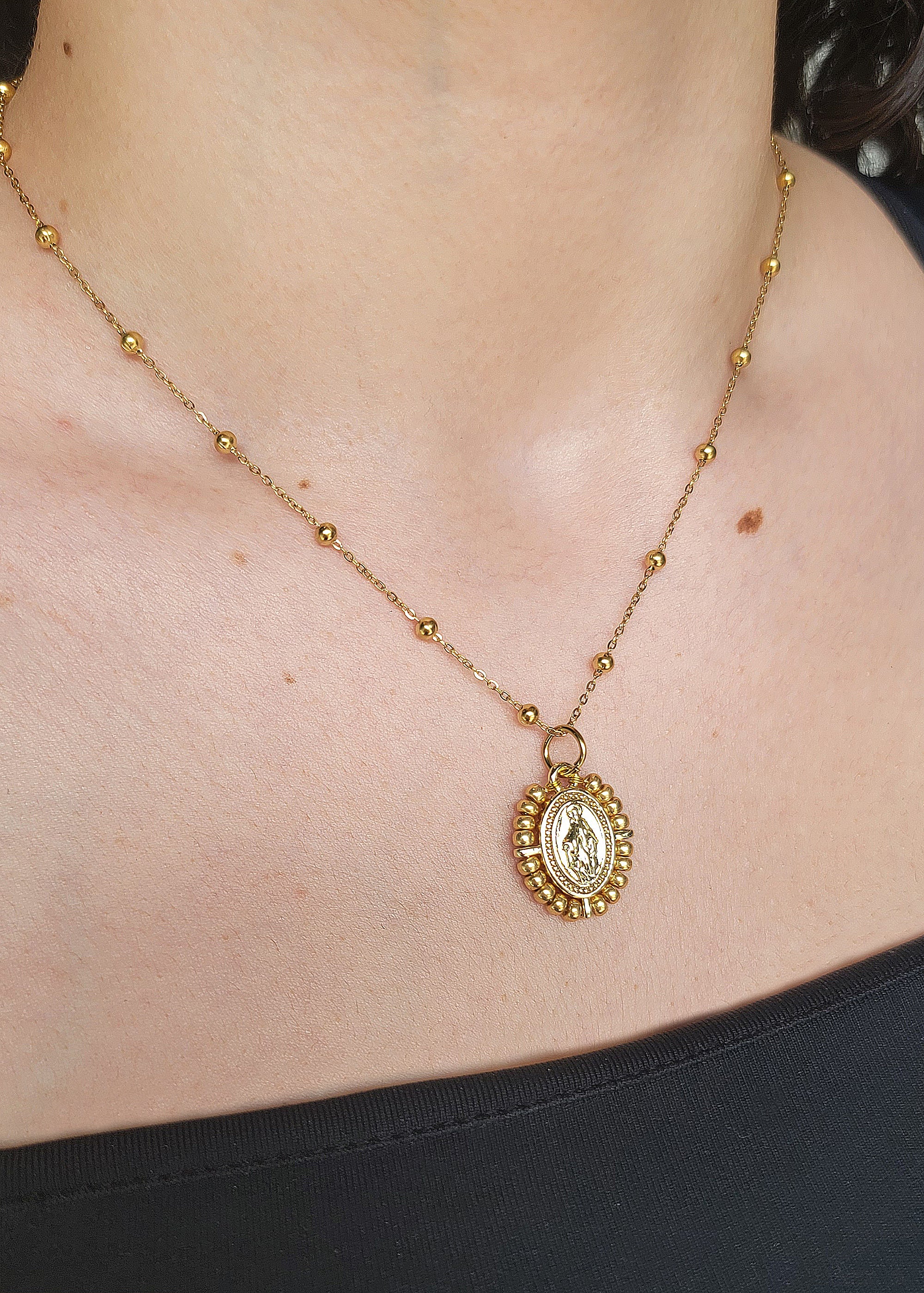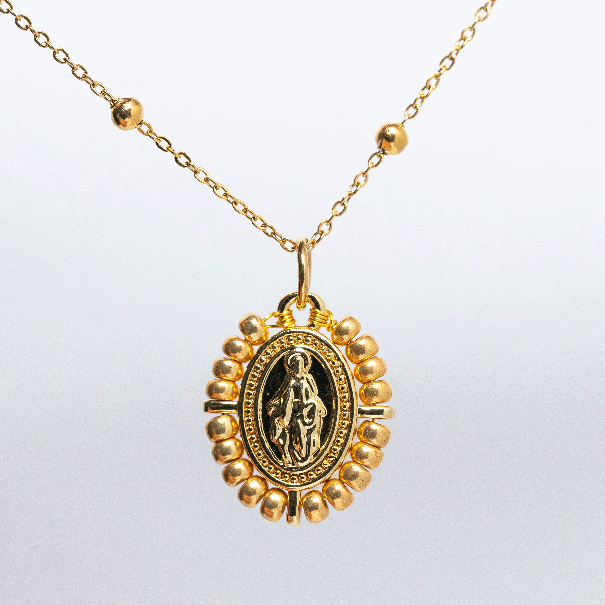 Collar con medalla de la Virgen María con cuentas de acrílico en color dorado, plateado y blanco, en acero inoxidable con chapa de oro de 14k.