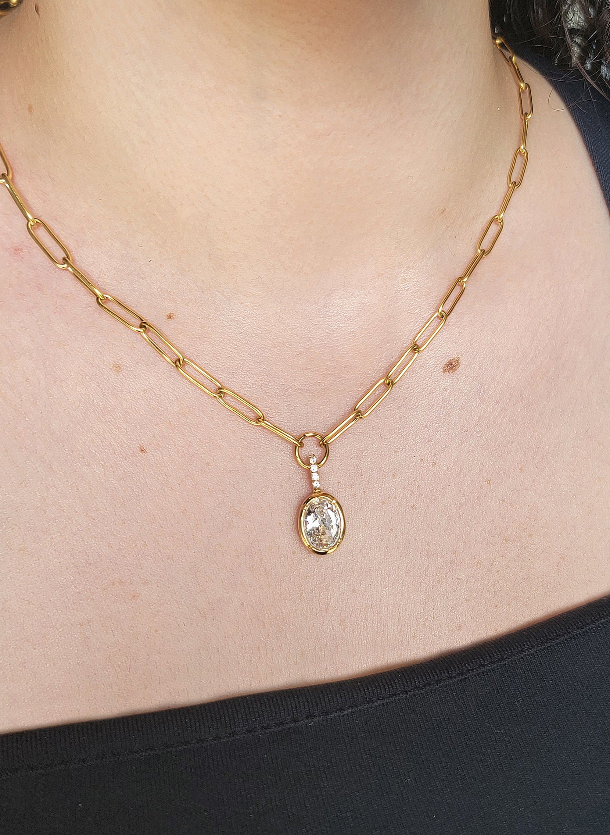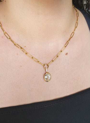 Collar de cadena con charm ovalado, en acero inoxidable con chapa de oro de 14k y zirconias.