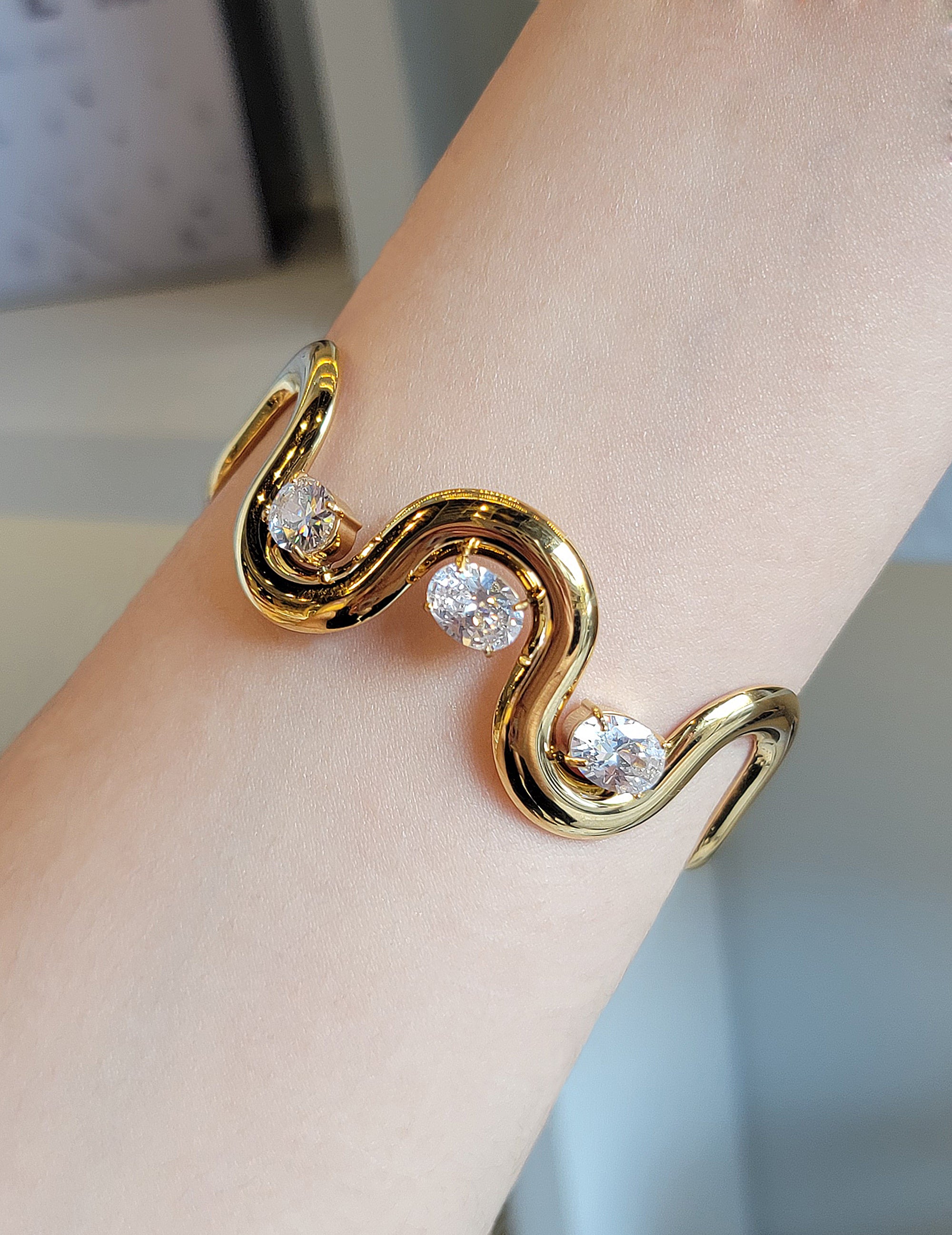 Brazalete ajustable con tres zirconias ovaladas, en acero inoxidable con chapa de oro de 14k.
