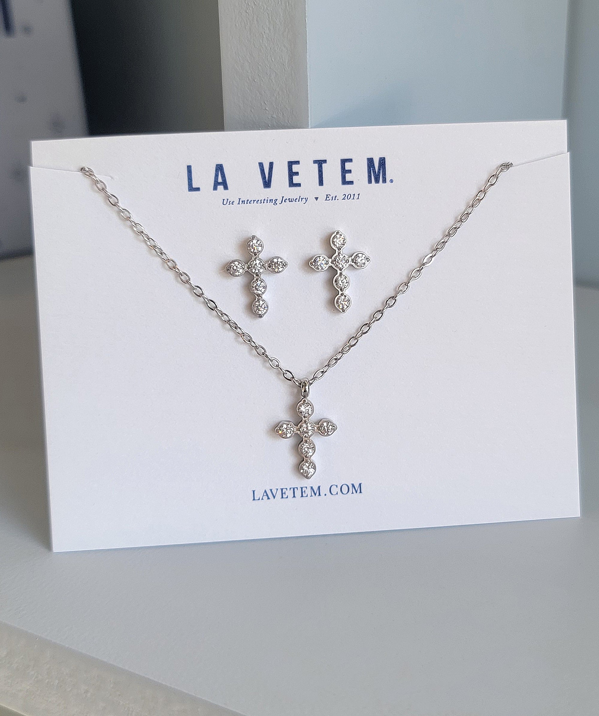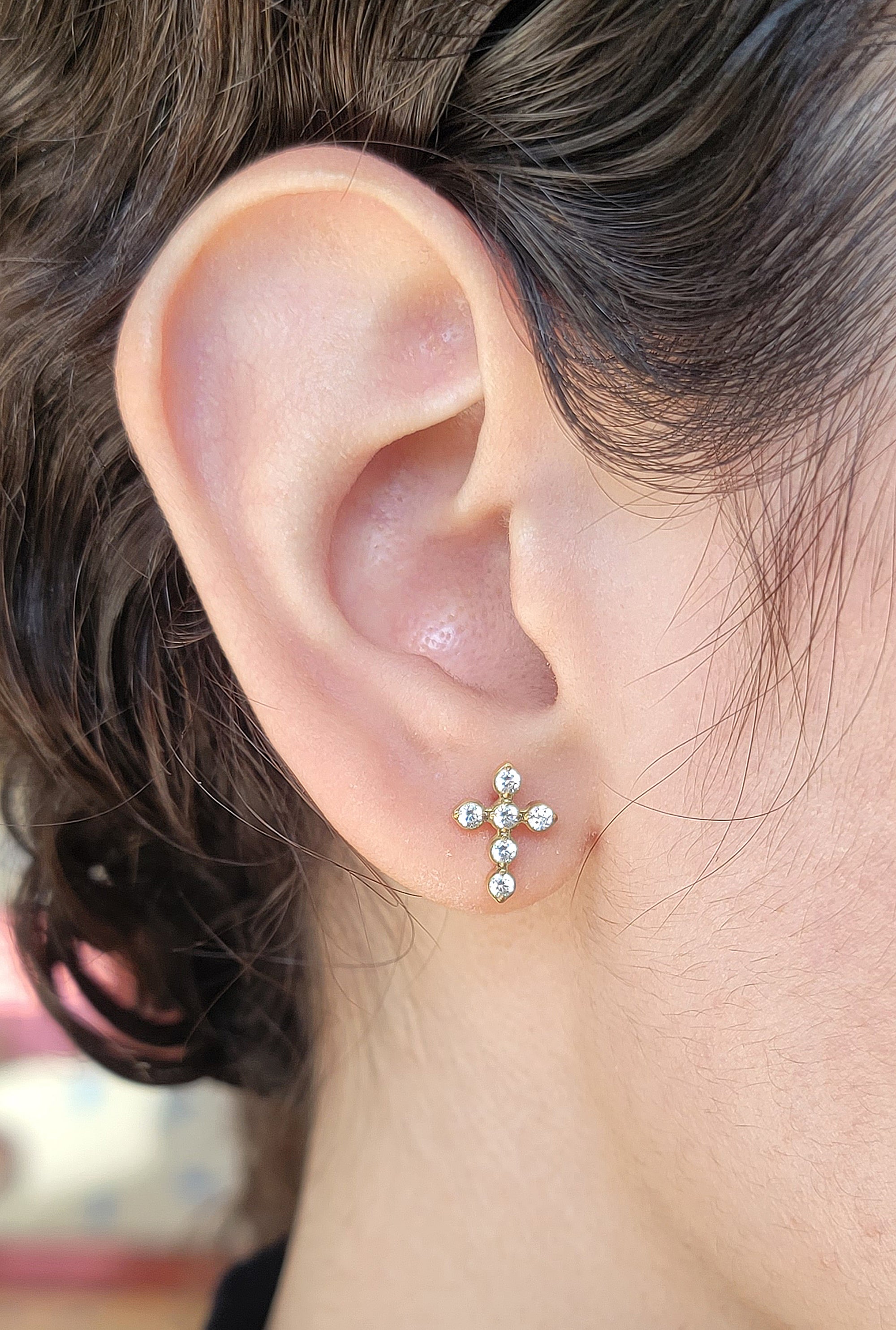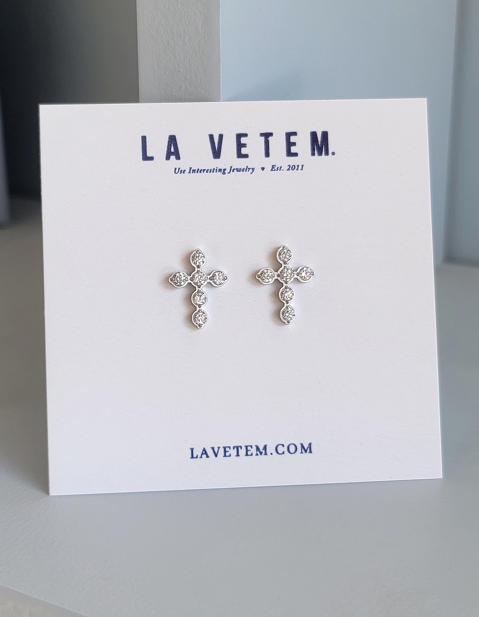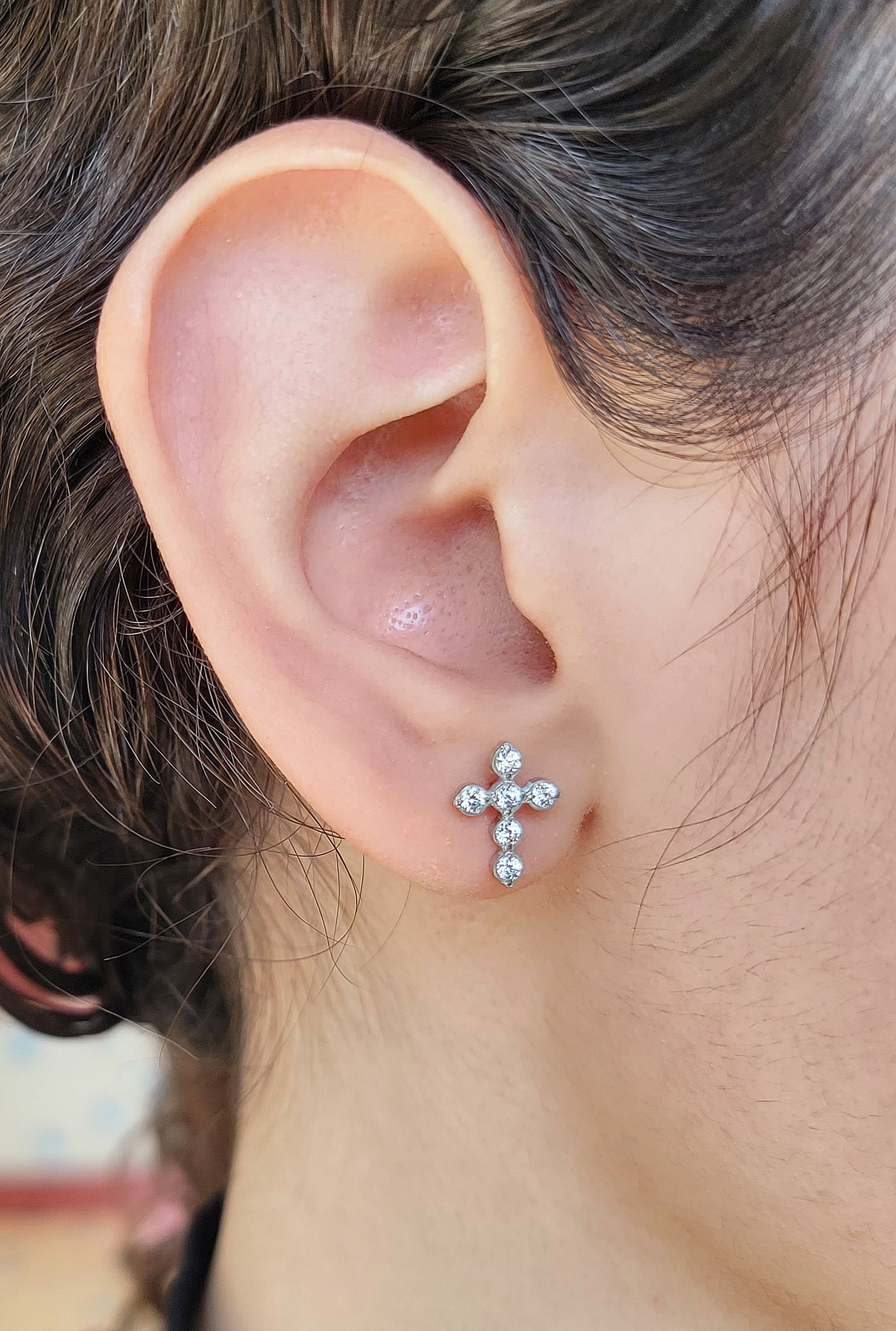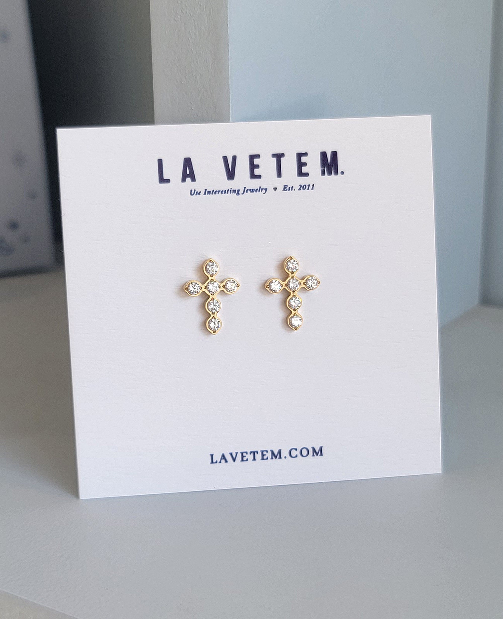 Aretes tipo studs de cruz, dorados y plateados en acero inoxidable con chapa de oro de 14k y zirconias.