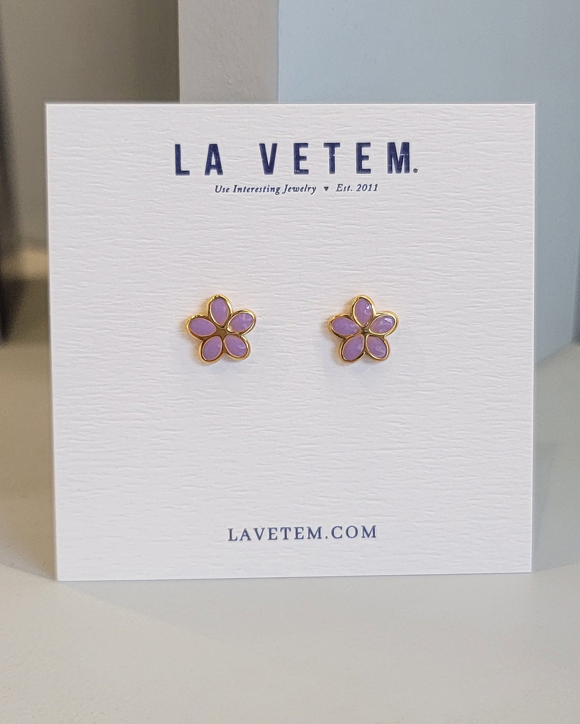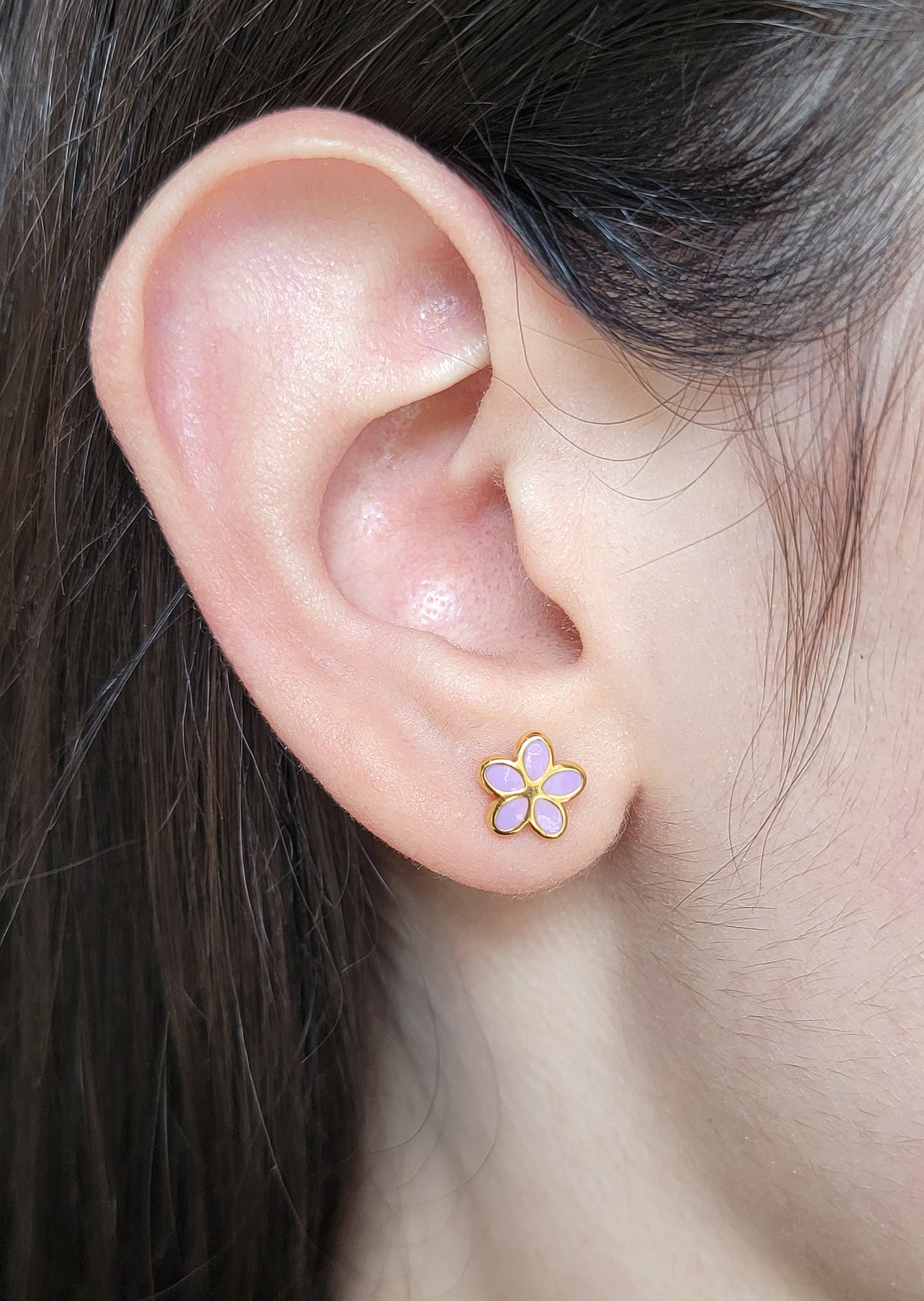 Arete tipo studs en forma de flor lila, en acero inoxidable con chapa de oro de 14k.