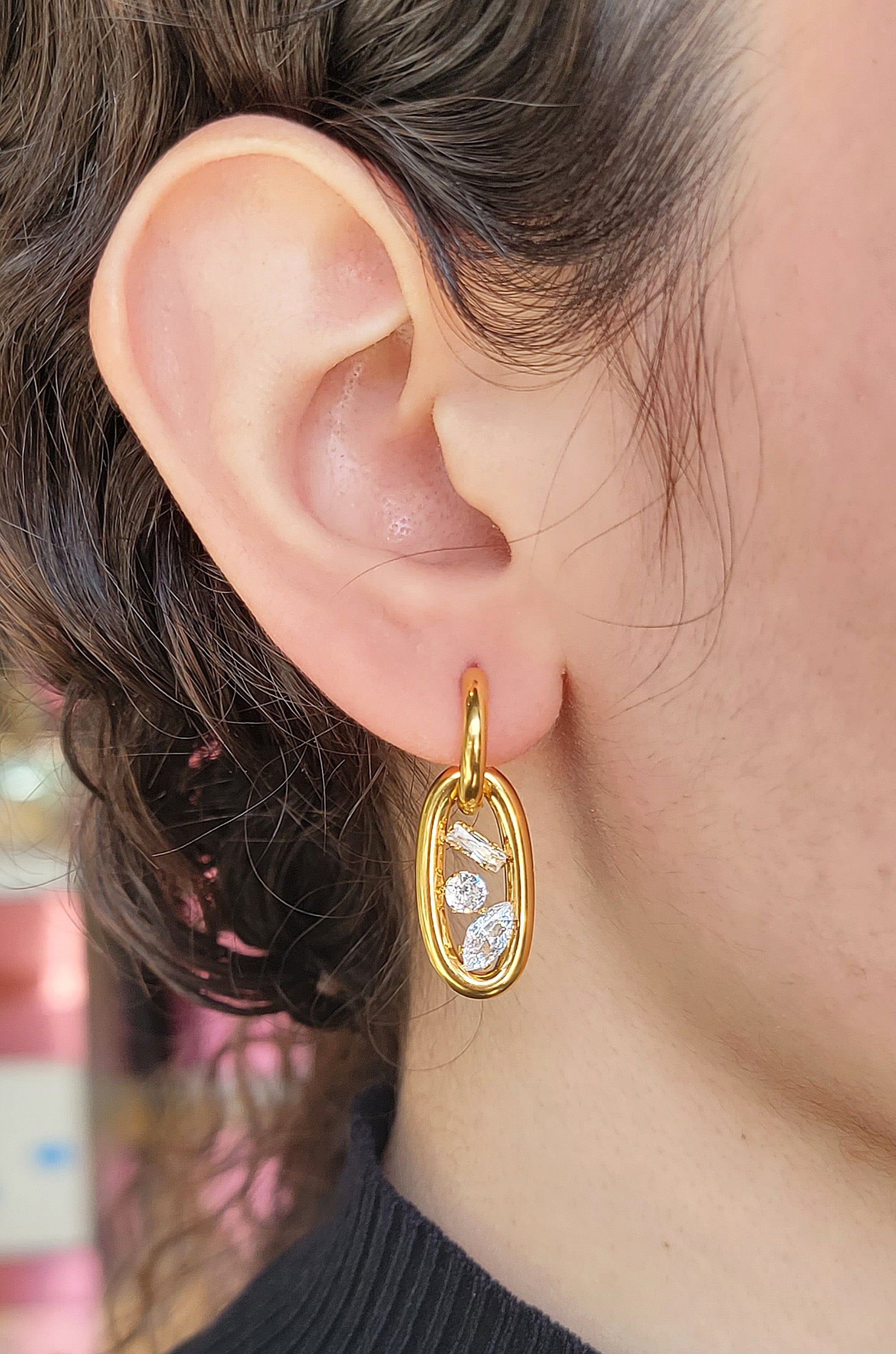 Arracada con charm ovalado, en acero inoxidable con chapa de oro de 14k y zirconias.