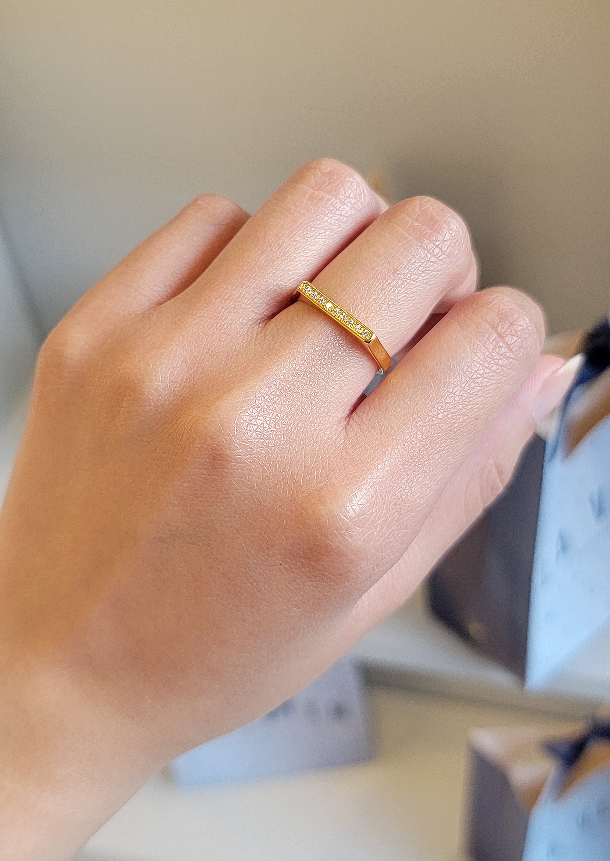 Anillo dorado de barra con zirconias, en acero inoxidable con chapa de oro de 14k.